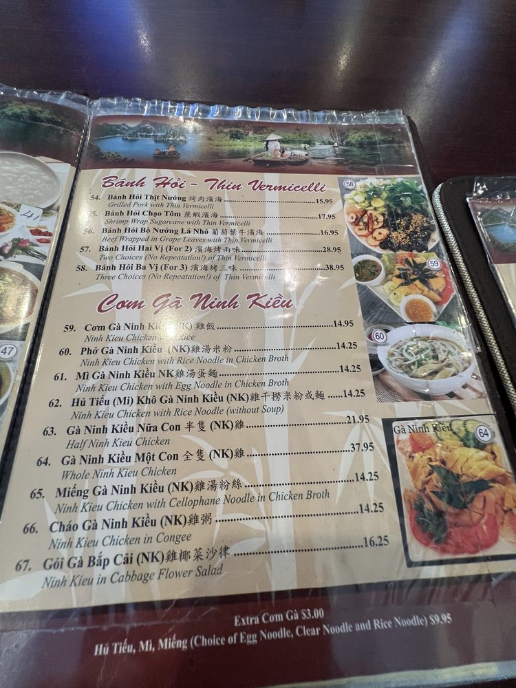 Com Ga Ninh Kieu is a Vietnamese soup spot located in Atlantic City, NJ. The menu features a variety of dishes such as Beef Noodle Soup Pho with different protein options, Com Tam Broken Rice with various toppings, and appetizers like Fried Spring Rolls and Vietnamese Pancakes. Customers rave about the flavorful and authentic pho broth, generous portions, and friendly service. The restaurant offers amenities like outdoor seating, free Wi-Fi, and parking options. Reviews highlight the cozy atmosphere and the quality of the dishes. Overall, Com Ga Ninh Kieu is a go-to spot for those craving delicious Vietnamese cuisine in a welcoming setting.
